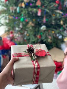 Go with a natural kraft paper and twine for a classic look and then affix festive touches — You really can’t go wrong with a beautiful kraft wrapping paper and some twine. It’s classic, chic and you can then get creative with what goes on top. Try using a sprig of rosemary and a cinnamon stick for a festive touch. You can also head outside in your yard and grab some greens! Why not use what you have right outside your door?