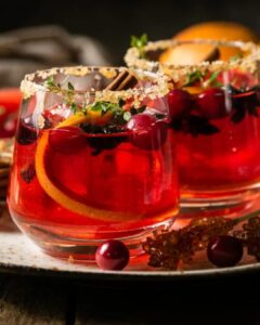 Cranberry Aperol Spritz: This twist on the traditional Aperol Spritz is light and refreshing and, of course, festive. We love how the tart cranberry syrup compliments the citrusy Aperol. Combine that with some fresh cranberries, dried orange garnish and a sprig of thyme and you have yourself a full-blow holiday cocktail! Optional to do a sugar rim if you’re really wanting to up your presentation game! GET THE RECIPE HERE