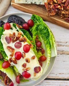 Deconstructed Leaf Lettuce Salad with Walnuts, Grapes, and Dijon Bleu Dressing: This is the kind of salad that proves simple ingredients can still feel special. Every bite brings contrast in the best way. Crisp leaf lettuce, sweet juicy grapes, and warm candied walnuts come together under a creamy Dijon bleu dressing that’s tangy, savory, and just bold enough. GET THE RECIPE HERE