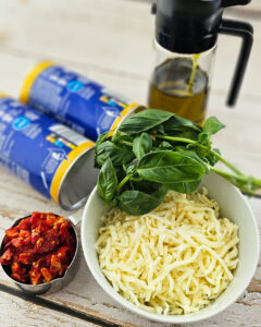 - Add the chopped sundried tomatoes, chopped basil, and shredded cheese, and drizzle the extra virgin olive oil over the mixture.
