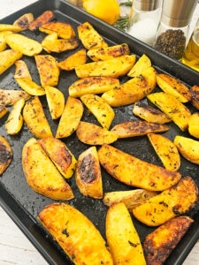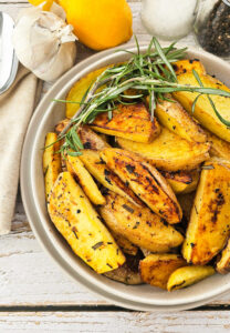 - In a large bowl, combine the potato wedges, fresh rosemary, garlic, Kosher salt, black pepper, fresh lemon juice, and olive oil. Toss well to combine and coat all the potatoes.