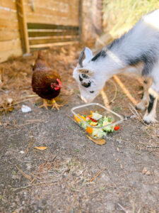 They’re also surprisingly helpful when it comes to compost. When we toss vegetable scraps, fruit peels, or garden waste into their area, the chickens scratch through everything, breaking it down faster while searching for snacks. Over time, this helps turn food scraps into nutrient-rich compost that can go right back into the garden.