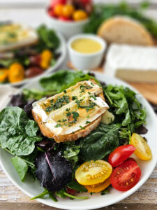 If you’re looking for a salad that feels a little elevated but still easy, our Melted Brie Salad delivers! Creamy brie gently melts over toasted rustic bread, while a drizzle of honey adds just the right touch of sweetness.