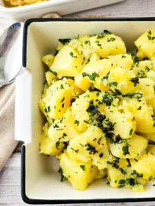 Parsley buttered potatoes are one of those simple sides that never disappoint. Tender, golden potatoes are tossed with melted butter, a touch of garlic, and plenty of fresh parsley for a bright, comforting finish. A sprinkle of Kosher salt at the end brings all the flavors together.
