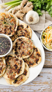 The filling gets pressed flat and seared hard for maximum crispy-edge coverage, then piled high with a bright, crunchy Asian Coleslaw  and finished with a glossy drizzle of dumpling dipping sauce.