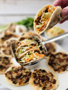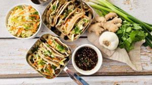 • Top tacos with the desired amount of Asian Coleslaw (recipe below) and drizzle with the dumpling sauce.