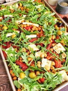 Sheet Pan with Roasted Heirloom Tomatoes, Feta, and Chickpeas: This is the kind of weeknight recipe that looks gourmet but couldn’t be easier to make. Roasted heirloom tomatoes, spiced chickpeas, creamy feta, peppery arugula, and briny green olives come together for a vibrant bite in every forkful. GET THE RECIPE HERE