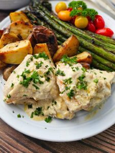 Upside-Down Chicken Sheet Pan: With minimal prep and maximum flavor, this dish combines juicy, tender chicken with a perfect medley of roasted veggies—all baked together in one pan for effortless cleanup. GET THE RECIPE HERE