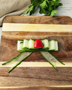 - For the final touch, using a vegetable peeler, make long slices on the outside of the English cucumber. Using about three ribbon slices, create a layered ribbon and a couple of dovetailed strips as the ribbon streamer. In the center, place one half of a grape tomato and trim as needed to fit.